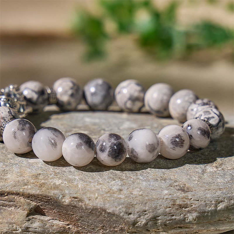 This bracelet combines the earthy resilience of Map Jasper with the protective energy of Pixiu and the spiritual depth of the Six True Words mantra, creating a grounded yet uplifting shield for your daily journey.