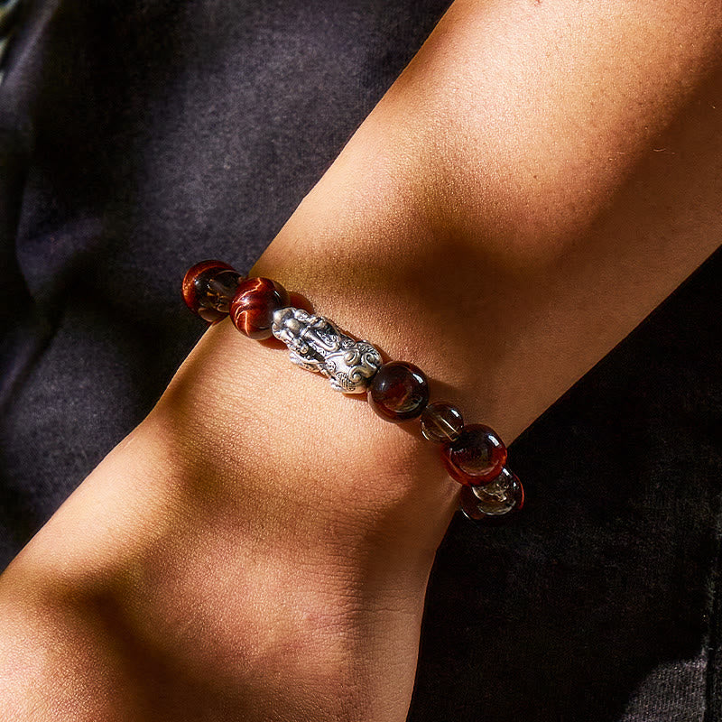 Experience the aligned power of Red Tiger’s Eye (Motivation), Tiger’s Eye (Courage), and Ice Obsidian (Protection)—balanced with Silver’s reflective clarity and Pixiu’s wealth-guiding force—purposefully combined to support sharper thinking, grounded emotions, and confident action.