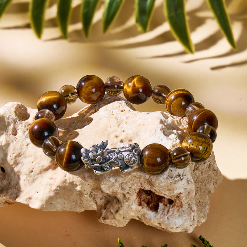 FuAttract Wealth Success Tiger's Eye & Ice Obsidian Silver Pixiu Bracelet