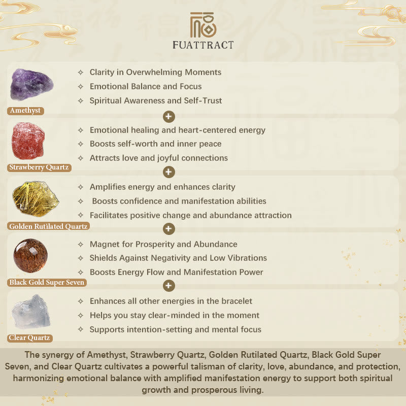 Experience the uplifting harmony of Amethyst, Strawberry Quartz, Golden Rutilated Quartz, Black Gold Super Seven, Clear Quartz, and Pixiu — a powerful blend designed to clear the mind, open the heart, amplify intentions, and attract lasting prosperity while protecting your energy.